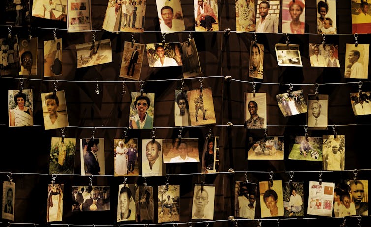 Family photos of the victims of the 1994 Rwandan genocide, displayed at a 25th anniversary memorial in April 2019. AP Photo/Ben Curtis