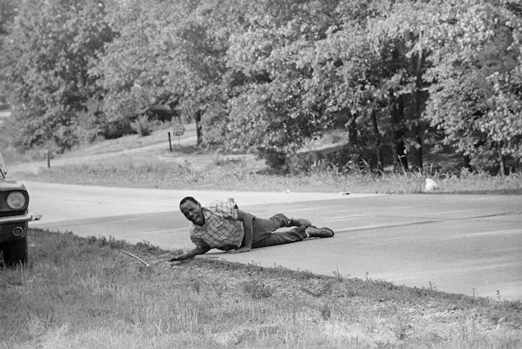 Civil rights activist James Meredith grimaces in pain as he pulls himself across Highway 51 after being shot in Hernando, Mississippi, during his March Against Fear. AP Photo/Jack Thornell, File