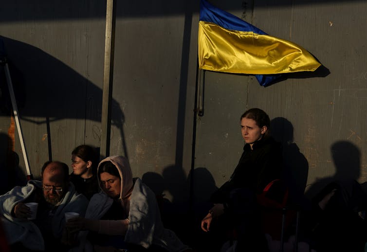 Ukrainian refugees wait near the U.S. border in Tijuana, Mexico. AP Photo/Gregory Bull