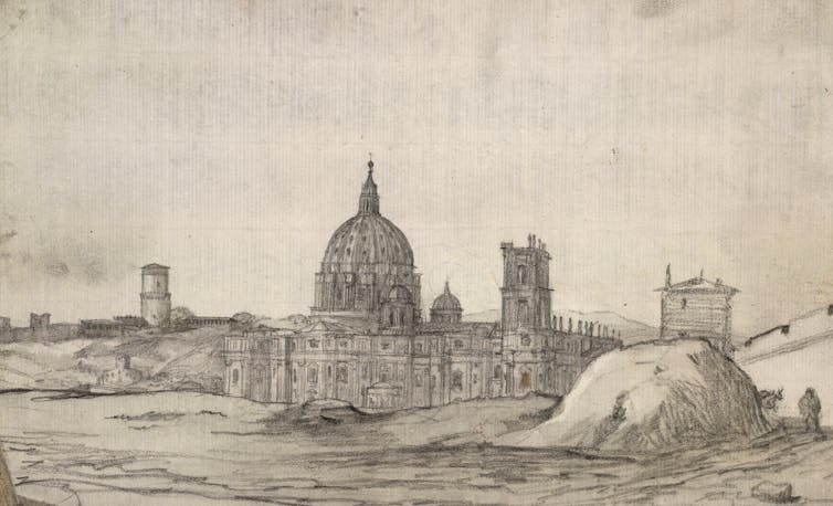 Drawing of St. Peter’s cathedral, Rome, with the Vatican wall in the left distance, c. 1640. (The Trustees of the British Museum), CC BY-NC-SA