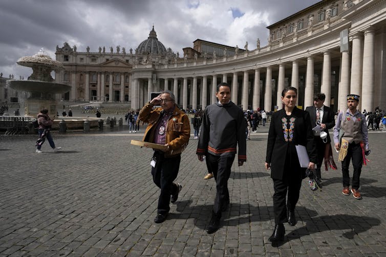 Indigenous delegates from Canada walk in St. Peter’s Square, at the Vatican, after their meeting with Pope Francis in April 1, 2022. (AP Photo/Alessandra Tarantino)