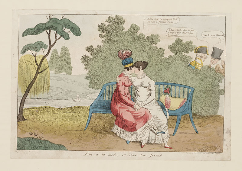 In these erotic works, lesbian sex is, perhaps unexpectedly, normalized. Phoebe’s desire for Fanny is surprising to Fanny but not unwelcome — and Fanny recognizes immediately that some women might prefer to have sex with other women. Depictions of real-life “sapphists” in the period aren’t hard to find, either — a historical reality that serves as the background for my new Regency romance Ladies in Hating, a Northanger Abbey-inspired romp about a pair of rival Gothic novelists. A satirical cartoon printed in 1820 called “Love-a-la-mode, or Two Dear Friends” shows Louisa, Lady Strachan, and Sarah, Lady Warwick, kissing on a park bench while their husbands sulkily watch from the bushes. Regency sculptor Anne Seymour Damer (1748-1828) was so well-known for her female romantic entanglements that a lady suspected of lesbian leanings might be said to have “visited Mrs. Damer.” Diarist Anne Lister declared in 1821: “I love & only love the fairer sex & thus beloved by them in turn my heart revolts from any other love than theirs.”