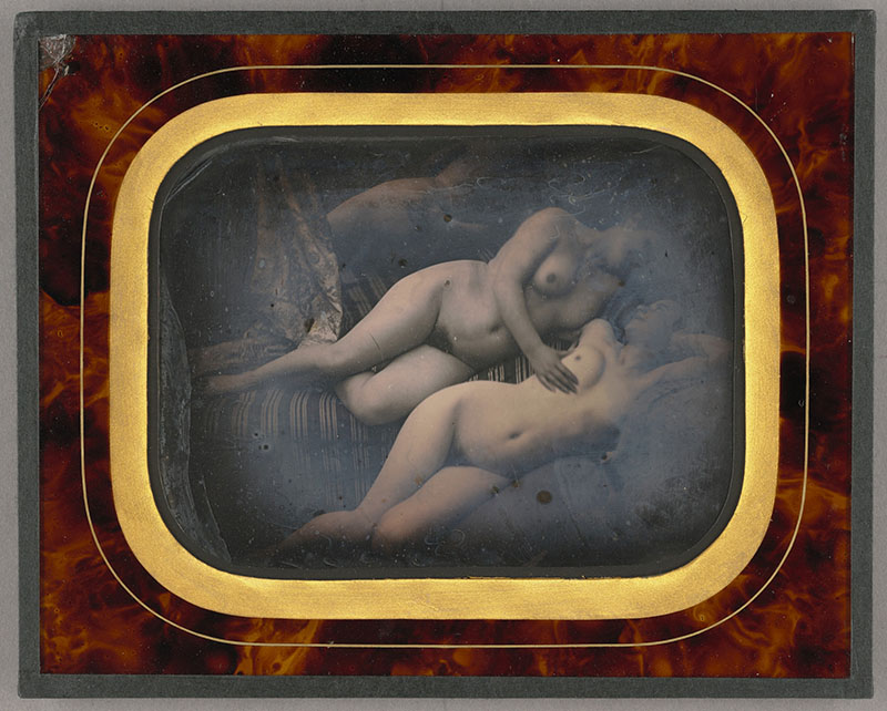 In 1839, the French government patented the daguerreotype process, making it public and available to anyone who wanted to take up photography. The process was time consuming, expensive, and yielded a single image. Yet even with these barriers, people almost immediately began to take nude photographs. Those nudes included images of women that were, if not explicitly lesbian, certainly lesbian-coded, with women depicted naked together or mid-caress.