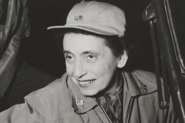 Shortly after the D-Day invasion in June 1944, FDR dispatched Rosenberg as his personal emissary to Europe, introducing her in a letter to General Dwight Eisenhower as “my warm friend.” She toured military hospitals in England, embedded with General George S. Patton’s Third Army (she called him “Georgie”), slept on the ground and ate K-rations, and interviewed soldiers about their post-war aspirations. Returning, she argued successfully for money for college to be added to the G.I. Bill, which had positive repercussions for millions of returning soldiers. FDR asked her to tour Europe a second time as the war was winding down, and though he died before she was due to leave, President Truman sent her on. She dealt with refugee problems and saw the horrors of a concentration camp, which had a profound effect on her as a Jew who would surely have met a similar fate had her family stayed in Europe.