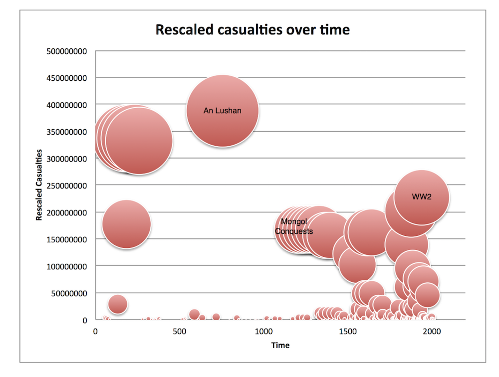 A striking chart accompanying the article dramatically shows the impact of violence on all periods of recorded history. The chart measures conflicts featuring more than 50,000 deaths relative to today's world population. (Thus, 50,000 deaths today = 5,000 deaths in the eighteenth century.)