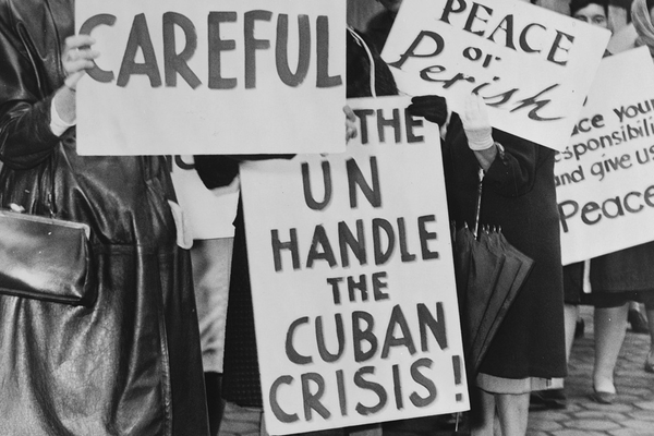 Some of the 800 members of Women Strike for Peace who marched at United Nations headquarters in Manhattan to demand UN mediation of the 1962 Cuban Missile Crisis