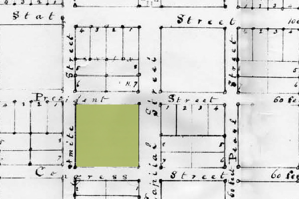 Jackson, Mississippi, too was to be laid out in a Jeffersonian checkerboard. “By varying street widths, reserving large sites for important buildings, and providing a connecting street to link these locations,” writes John Reps in “Thomas Jefferson’s Checkerboard Towns,” “the planners of Jackson improved markedly on the layout of Jeffersonville.” Once again, the temptation to fill the empty spaces proved too great and there is today little trace of the original plan.