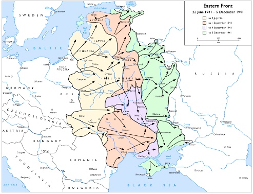 As the map above shows, the scale of the invasion was unprecedented -- 4 million Wehrmacht troops were hurled into the Soviet Union. The Germans rapidly conquered virtually all of its European territory from the suburbs of Leningrad through Moscow down to Rostov, destroyed most of the Soviet army and killed hundreds of thousands of civilians.