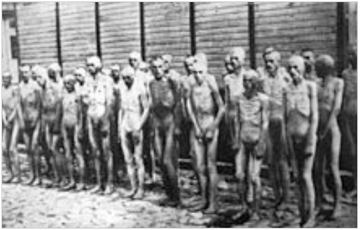 There was contemporary reason for those deep fears. The Nazis never seriously considered collaboration with the Ukrainians. Military strategists thought they could defeat Russia without any help; Party ideologues considered Ukrainians who after all were Slavs to be untermenchen; and Nazi economists planned to get rid of 30 or so million of the "surplus population" of the rich "Black Earth" or Ukrainian area and to reduce the survivors into slave laborers to farm it. Moreover, Ukrainian consumption of food competed with German needs so the Germans adopted the Hungerplan to starve the population. Hardest hit were those most accessible: the prisoners of war. The picture below shows a few of the nearly 3 million Russian POWs who were starved to death by the German Army.19