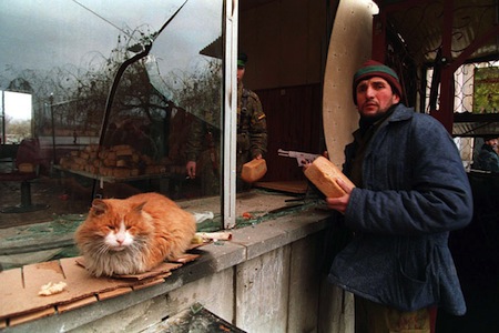A Chechen man picks up a loaf of bread in Grozny in 1995. Credit: Wiki Commons.